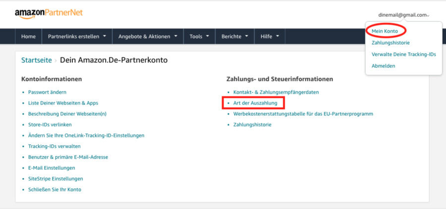 Log ind på din Amazon Associates-konto, klik på din e-mailadresse, og vælg derefter Mein Konto (Min konto).
