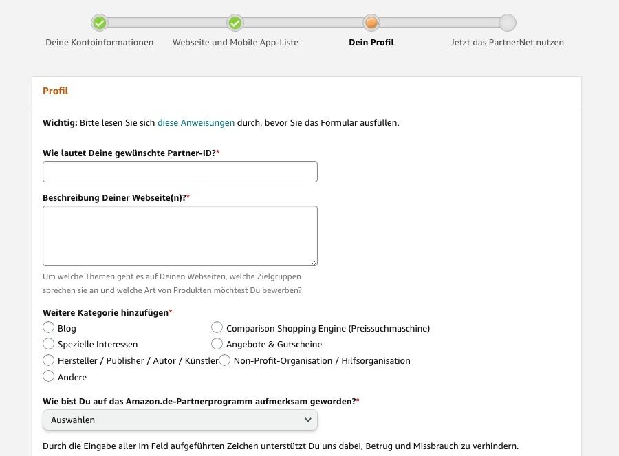 Før du udfylder din Amazon Associates-ansøgning, skal du oprette en profil. De vigtigste områder at overveje på næste side er: