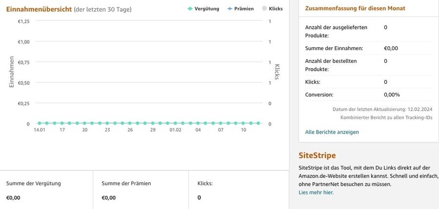 Du kan se dine 30-dages analyser ved at scrolle ned på hjemmesiden. Her finder du en graf, der skitserer det samlede antal klik, indtjening og meget mere.