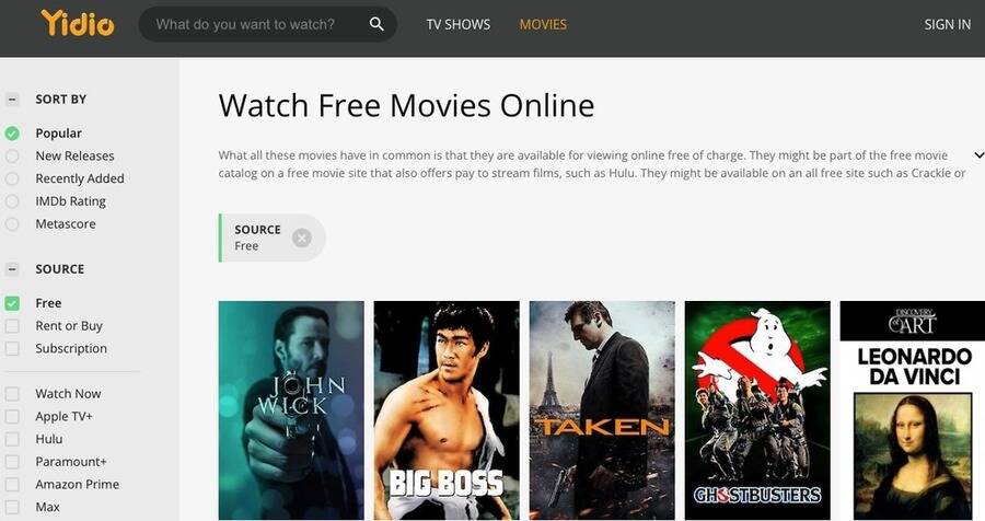 Selvom Yidio ikke er en videohost, fungerer den som en fremragende aggregator for gratis streaming af film og tv-serier. Den måde, Yidio fungerer på, er ved at omdirigere dig til tredjepartstjenester som Amazon Prime, Netflix og andre. Derfor kræver visse film og serier her et abonnement.