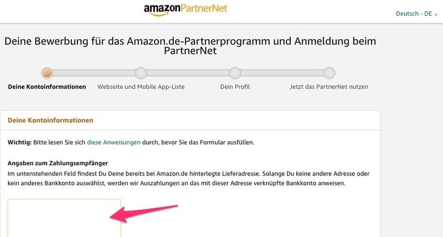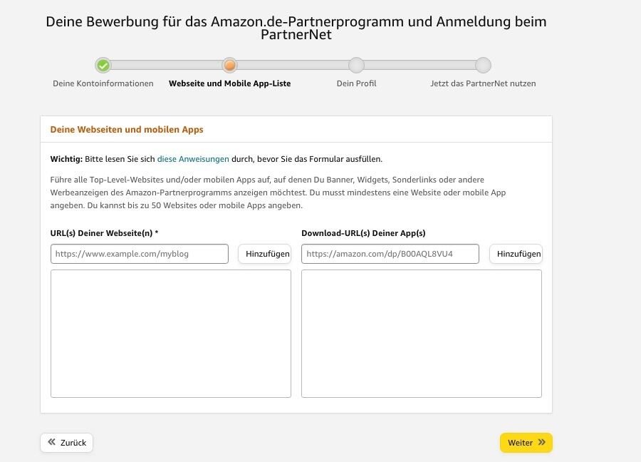 Du skal fortælle Amazon, hvor du har tænkt dig at dele de links, du opretter med din Amazon Associates-konto. Når du har indtastet de første oplysninger, vil du se et afsnit med titlen Deine Webseiten und mobilen Apps (Dine hjemmesider og mobilapps) på næste side.