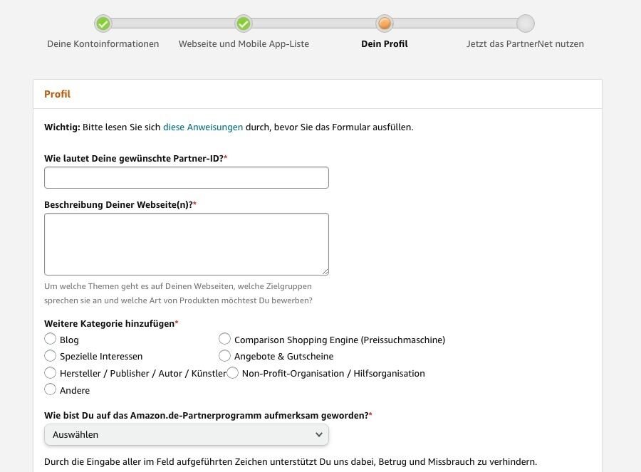Før du udfylder din Amazon Associates-ansøgning, skal du oprette en profil. De vigtigste områder at overveje på næste side er: