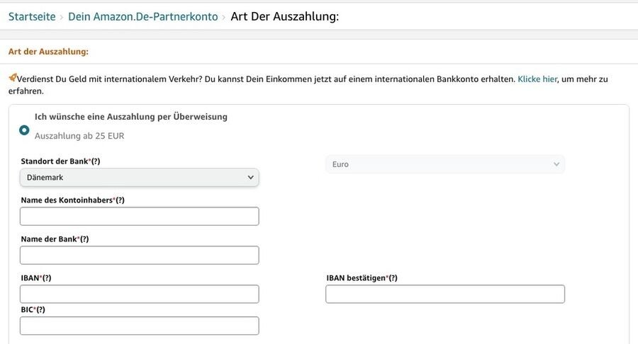 Vælg Ich wünsche eine Auszahlung per Überweisung (Jeg vil gerne have en betaling via bankoverførsel), og indtast dine oplysninger.